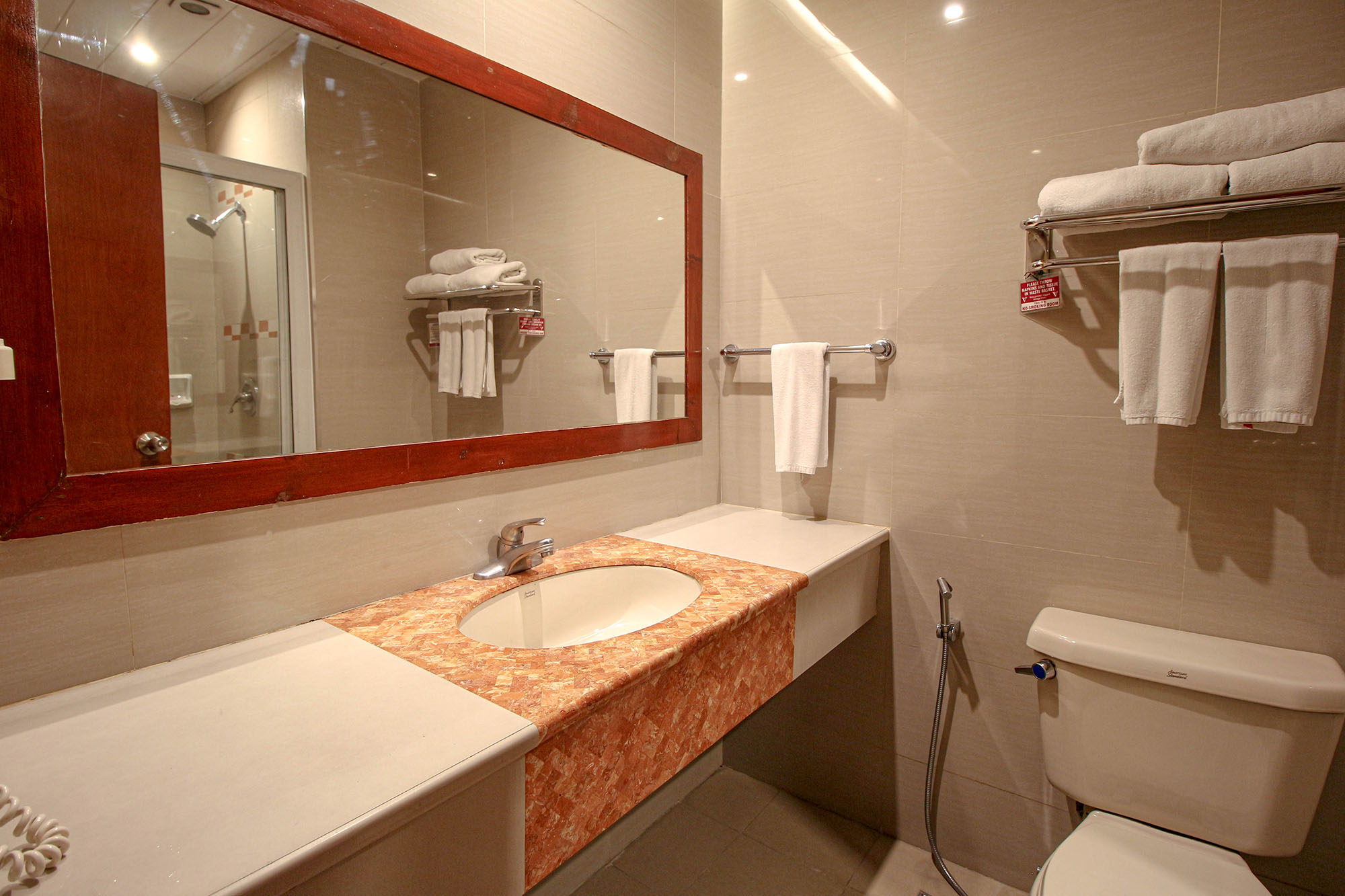 The Deluxe Trio Room has a queen-size bed and a single bed with a balcony overlooking the city.